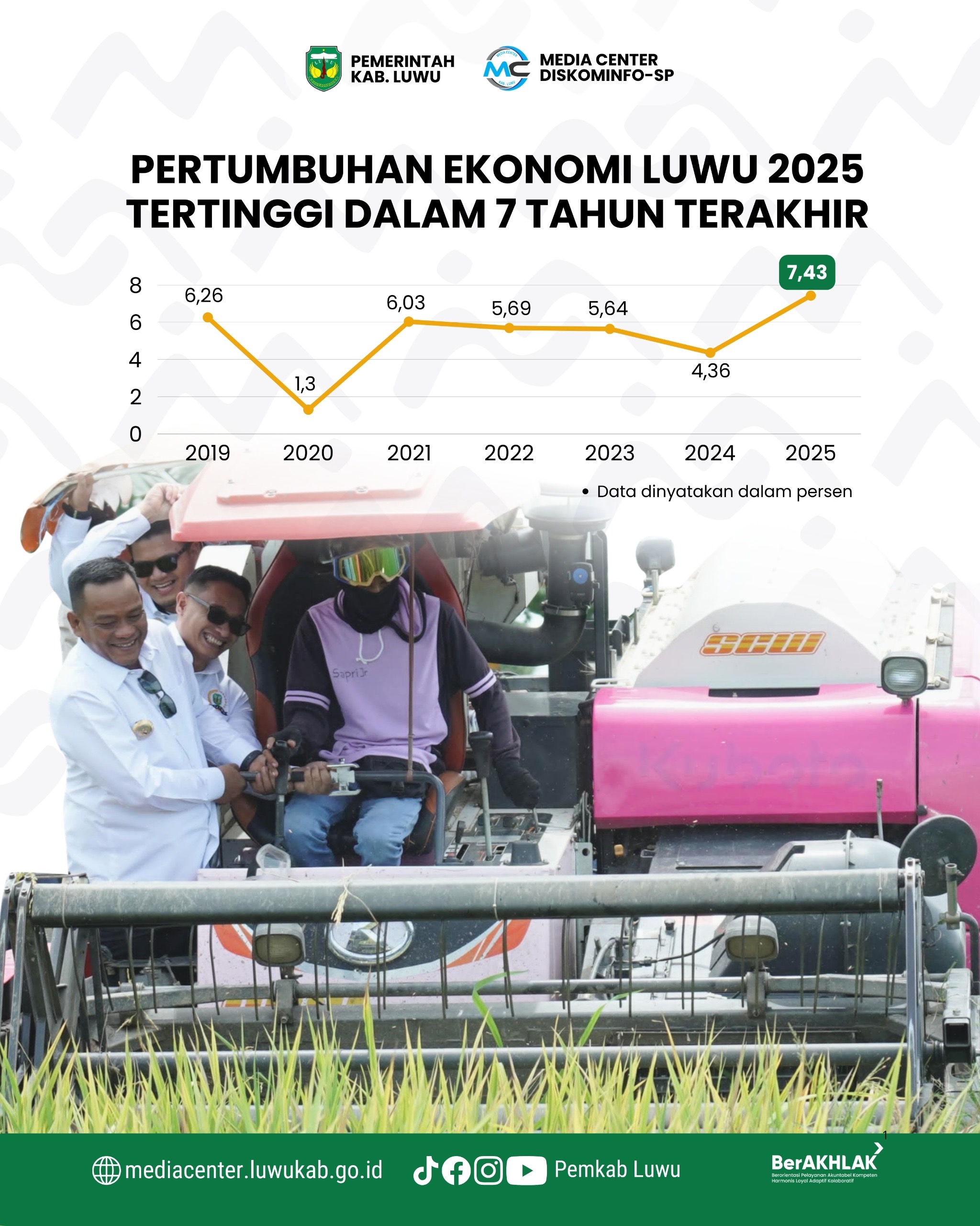 Jagadnews.id | Luwu – Pertumbuhan ekonomi Kabupaten Luwu tahun 2025 mencapai 7,43 persen berdasarkan data Badan Pusat Statistik (BPS) Kabupaten Luwu. Capaian ini menjadi yang tertinggi dalam tujuh tahun terakhir sekaligus menandai momentum pemulihan ekonomi daerah.