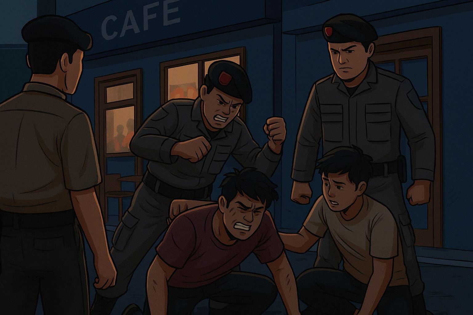 “Ia dipukul menggunakan benda menyerupai ikat pinggang, ditendang di bagian pinggang, dan didorong hingga tersandar di pintu kios dekat kafe,,” lanjut Sahrir.